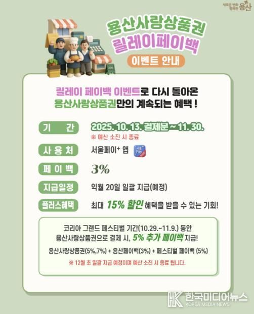특히 10월 29일부터 11월 9일까지 열리는 ‘코리아 그랜드 페스티벌’ 기간에 용산사랑상품권으로 결제하면, 추가 5% 페이백 혜택이 제공될 예정이다. 이 기간에는 기존 3% 페이백 혜택을 포함해 최대 15%의 할인 혜택을 받을 수 있다. 다만 해당 페이백은 예산 한도 내에서 선착순으로 지급되며, 예산이 조기 소진될 경우 행사는 종료된다.