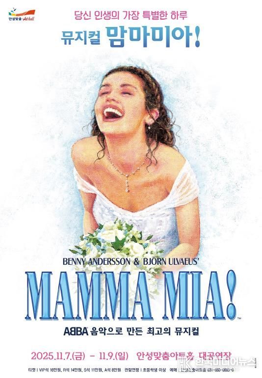 [ 한국미디어뉴스 이보영 기자 ] 안성맞춤아트홀은 오는 11월 7일부터 9일까지 대공연장에서 세계적인 히트 뮤지컬 '맘마미아!'를 무대에 올린다. 세대를 초월한 명곡과 유쾌한 스토리로 사랑받아온 이번 작품은 남녀노소 누구나 즐길 수 있는 최고의 힐링 뮤지컬이다.