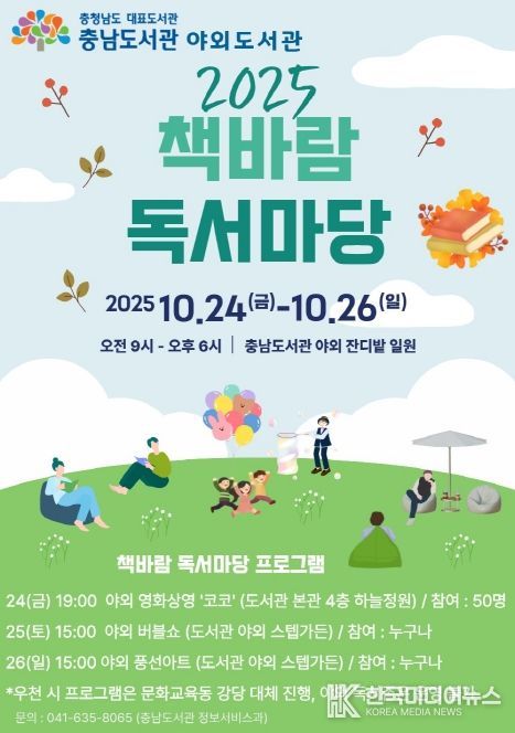 [ 한국미디어뉴스 김서안 기자 ] 충남도서관은 오는 24∼26일 충남도서관 일원에서 ‘2025 책바람 독서마당’ 야외도서관 행사 및 문화 프로그램을 진행한다고 23일 밝혔다.