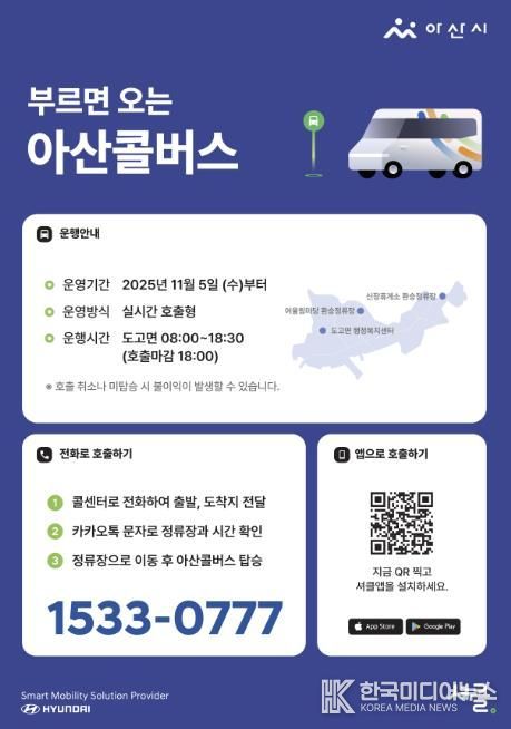 [ 한국미디어뉴스 김서안 기자 ] 아산시가 도고면 지역의 관광 활성화와 주민들의 이동 편의성 제고를 위해 오는 11월 5일부터 수요응답형 공공형 버스(DRT) ‘아산콜버스’를 시범 운행한다.
