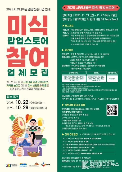 [ 한국미디어뉴스 이보영 기자 ] 세종시문화관광재단이 ‘2025 서부내륙권 관광진흥사업’의 일환으로, 수도권 소비자에게 세종의 우수한 미식 자원을 소개할 ‘서부내륙권 미식 팝업스토어’ 참여업체를 공개 모집한다. 공모를 통해 선정된 업체는 국내 트렌드를 선도하는 현대백화점 ‘더현대 서울’(지하 1층 Tasty Seoul관)에서 소비자들을 직접 만날 예정이다.