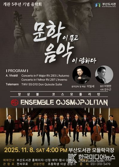 [ 한국미디어뉴스 이원영 기자 ] 부산도서관 개관 5주년 기념음악회 '문학이 묻고 음악이 답하다'에 참여하여 깊어가는 가을 아름다운 음악으로 가슴 따뜻한 추억을 만들어 보세요!