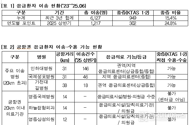 국회 국토교통위원회 소속 배준영 의원(국민의힘·인천 중구‧강화‧옹진)이 국토교통부‧보건복지부‧인천국제공항공사로부터 제출받은 자료를 분석한 결과, 최근 3년간 인천공항 및 인근 지역의 응급환자 이송은 총 6,127건이었고, 이 중 중증환자(KTAS 1‧2) 949명(15.4%)으로 확인됐다. 올해 상반기만 해도 1,217건 중 302명(24.8%)이 생명위급 단계였다.