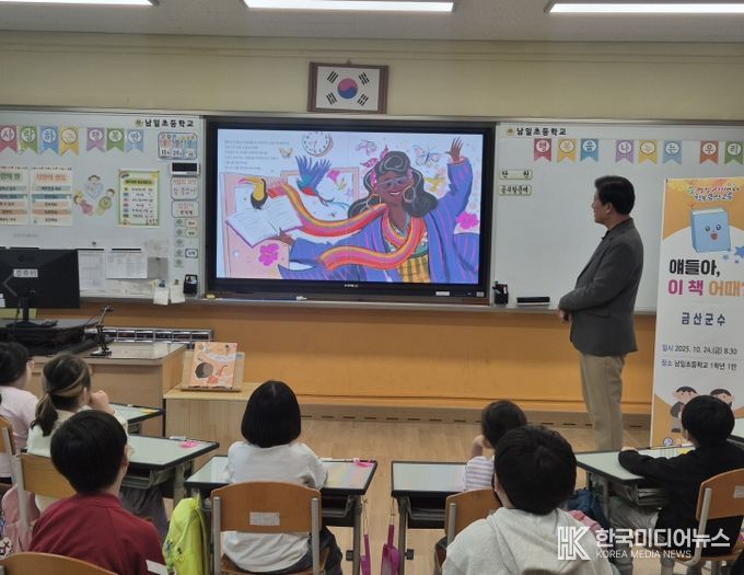 [ 한국미디어뉴스 김서안 기자 ] 박범인 금산군수는 지난 24일 남일초를 방문해 학생들과 함께 그림책 읽는 시간을 가졌다.