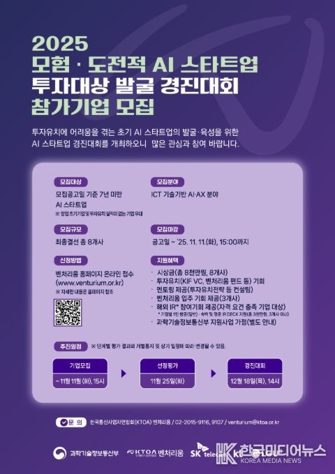 [ 한국미디어뉴스 이원영 기자 ] 과학기술정보통신부는 혁신적인 기술력과 성장 잠재력을 보유하고 있음에도 투자유치에 어려움을 겪어온 초기 단계 인공지능 새싹기업(스타트업)을 지원하기 위해 ‘모험·도전적 인공 지능 새싹기업(스타트업) 투자대상 발굴 경진대회’를 10월 28일 본격 착수한다고 밝혔다.