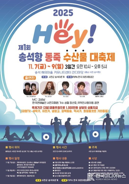 [ 한국미디어뉴스 김서안 기자 ] 서천군 마서면 송석어촌계가 11월 7일부터 9일까지 사흘간 송석항 일원에서 ‘제1회 헤이(HEY) 송석항 동죽 수산물 대축제’를 연다.