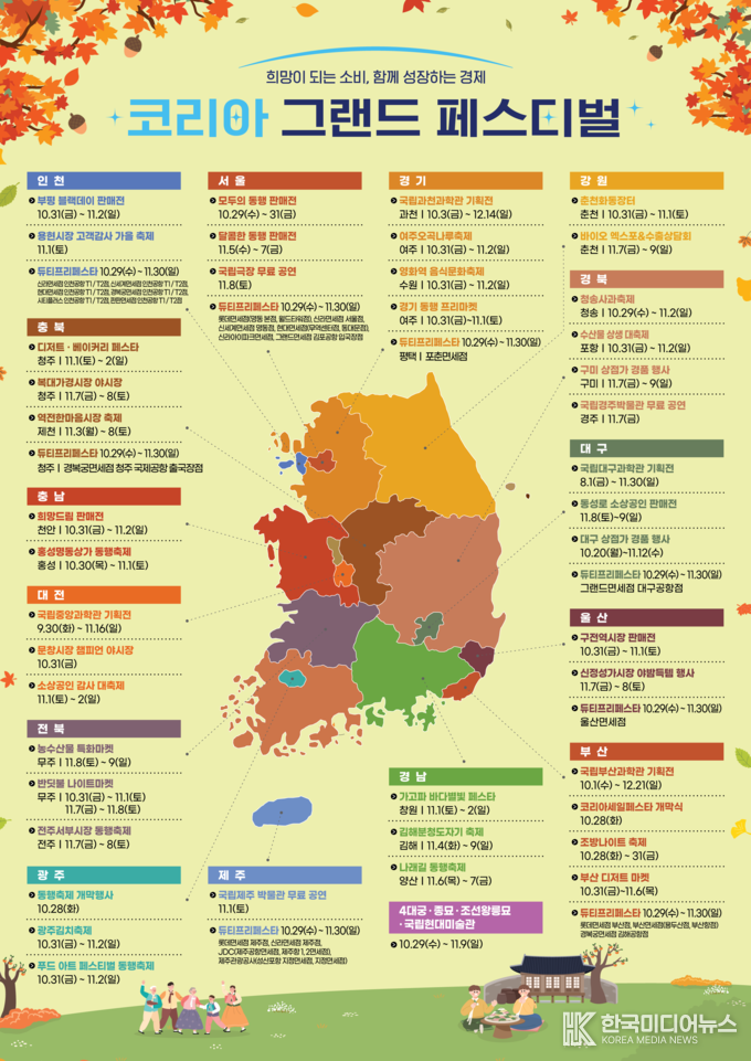 ‘코리아 그랜드 페스티벌’은 소비 회복 흐름을 경제 전반으로 확산시키기 위해 마련한 국가 단위 대규모 소비 축제로, 10월 29일(수)부터 11월 9일(일)까지 12일간 온·오프라인 할인행사와 온누리 환급 행사 등 소비 활성화를 위한 행사를 진행한다.