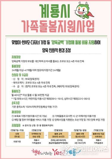 [ 한국미디어뉴스 김서안 기자 ] 계룡시는 조부모 등 4촌 이내 친인척이 부모를 대신해 2~3세 영유아를 월 40시간 이상 돌봄을 제공할 경우 아이 1명당 월 30만원의 가족돌봄수당을 지급하는 ‘계룡시 가족돌봄지원 사업’을 11월 본격 시행한다고 밝혔다.