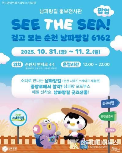 [ 한국미디어뉴스 이종철 기자 ] 순천시는 푸드앤아트페스티벌이 열리는 중앙로 일대에 남파랑길 홍보 전시관을 운영해 순천의 바다와 길을 ‘소리’로 만나는 감각적인 공간을 마련한다고 밝혔다.