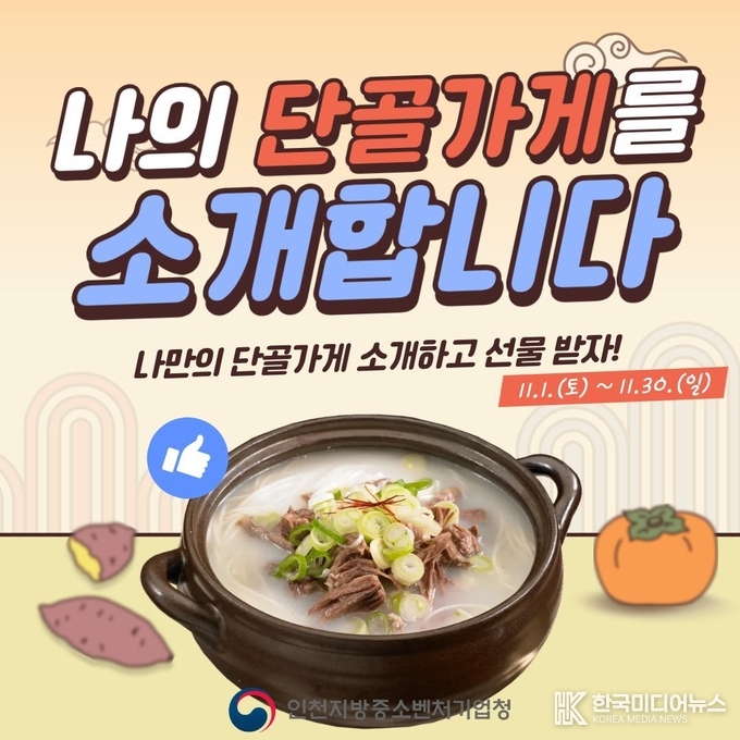 [ 한국미디어뉴스 이원영 기자 ] 중소벤처기업부 인천지방중소벤처기업청(청장 강해수, 이하 인천중기청)은 소비 촉진 캠페인의 일환으로 ⌜나의 단골가게를 소개합니다⌟ 이벤트를 11월 1일(토)부터 11월 30일(일)까지 진행한다고 밝혔다.