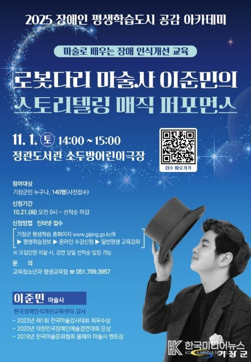 [ 한국미디어뉴스 이원영 기자 ] 기장군은 오는 11월 1일 오후 2시 정관도서관 소두방어린이극장에서 장애인평생학습도시 공감 아카데미‘장애 인식개선 마술공연’을 개최한다고 31일 밝혔다.