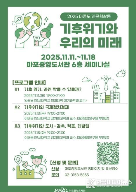 한편 마포중앙도서관에서는 같은 달 11월 11일부터 18일까지 ‘기후 위기와 우리의 미래’를 주제로 ‘하반기 마중도 인문학 살롱’을 운영한다.