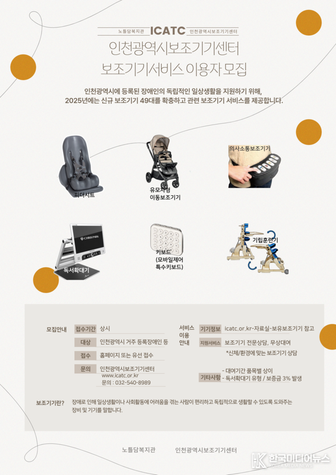 [ 한국미디어뉴스 이원영 기자 ] 인천광역시보조기기센터(센터장 이선애)는 2025년 9월, 신규 보조기기 49대를 확충하여 이용자를 상시모집한다고 4일 밝혔다.