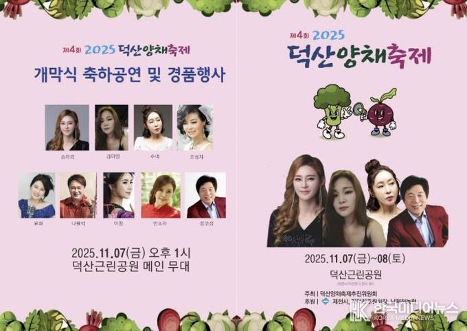 [ 한국미디어뉴스 김풍옥 기자 ] 제천시 대표 농산물 “양채”의 우수성을 널리 알리고, 농가 소득 증대 및 지역경제 활성화를 도모하기 위한 2025년 제4회 덕산 양채축제가 오는 11월 7일부터 8일까지 2일간 덕산근린공원(덕산면 도전리 367번지) 일원에서 개최된다.