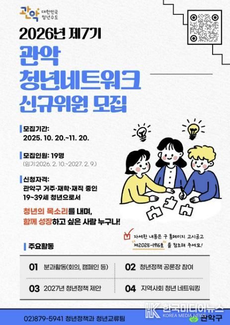 [ 한국미디어뉴스 이보영 기자 ] 청년친화도시 관악구가 청년들이 직접 청년을 위한 정책을 발굴하고 제안하는 '제7기 관악청년네트워크' 위원 19명을 신규 모집한다.