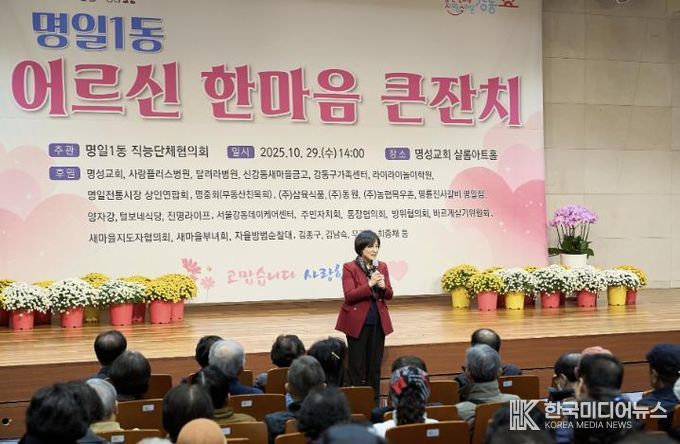 [ 한국미디어뉴스 이보영 기자 ] 서울 강동구 명일1동은 지난 10월 29일 명성교회 샬롬아트홀에서 관내 어르신 250여 명을 모시고, ‘명일1동 어르신 한마음 큰잔치’를 성황리에 개최했다고 밝혔다.
