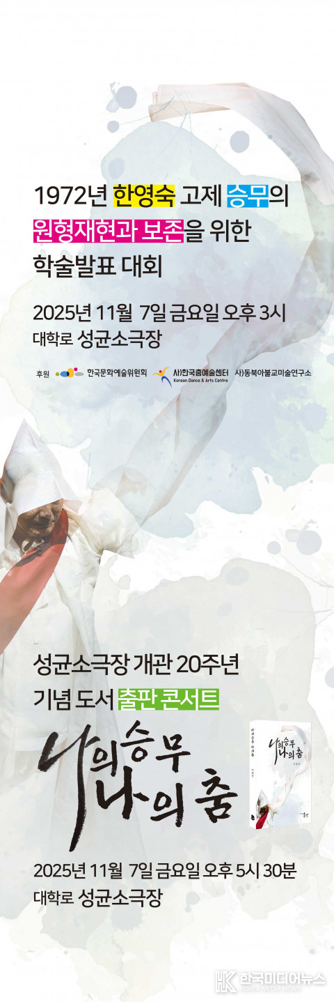 2006년 개관한 성균소극장은 ‘365일 춤과 노래가 있는 극장’을 모토로 한국 전통춤과 무용의 활성화를 위해 대학로에서 소극장 운동을 선도해왔다. 장기공연 시스템을 통해 무용단의 경쟁력을 높이고, 관객이 예술의 성장 과정을 함께 경험할 수 있는 무용 전용극장으로 자리매김했다. 이번 학술발표회 및 ‘나의 승무 나의 춤’ 출판기념회는 성균소극장 개관 20주년을 맞이하는 의미 있는 자리로, 전통춤의 계승과 새로운 예술적 해석을 함께 나누는 축제의 장이 될 것이다.