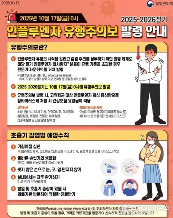 질병청은 2025-2026절기 인플루엔자 유행이 지난해보다 두 달가량 일찍 시작됐으며, 올겨울 지난 절기처럼 크게 유행할 가능성이 있다고 예상했다.