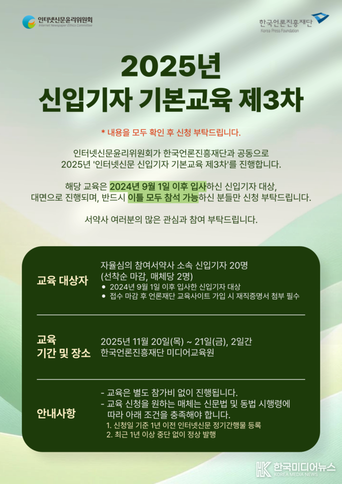 [ 한국미디어뉴스 이원영 기자 ] 인터넷신문윤리위원회(위원장 이재진, 이하 ‘인신윤위’)는 31일, 프레스센터에서 「2025 인터넷신문윤리 조찬포럼」을 열었다,