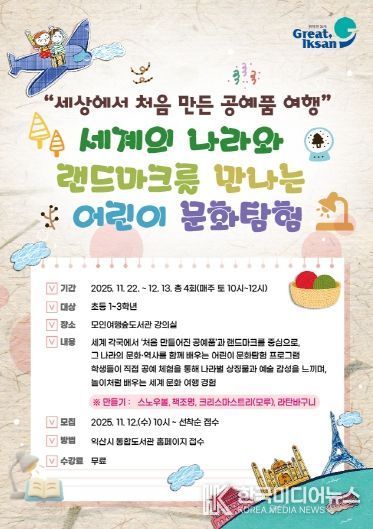 익산시 관계자는 "아이들이 손으로 배우고 눈으로 느끼며 세계의 다양성을 이해하는 시간이 될 것"이라며 "놀이처럼 즐기는 문화여행을 통해 도서관이 더욱 친근한 배움의 공간으로 다가가길 바란다"고 말했다.