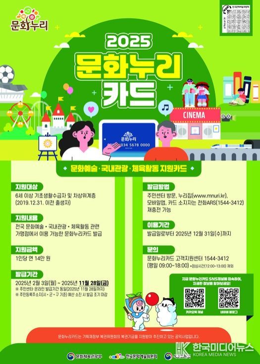 [ 한국미디어뉴스 김풍옥 기자 ] 충북 영동군은 2025년 문화누리카드(통합문화이용권) 지원금이 올해 말까지 전액 사용될 수 있도록 이용자들의 적극적인 사용을 당부한다고 11일 밝혔다.