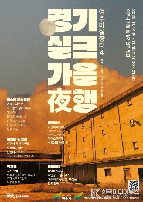 [ 한국미디어뉴스 이보영 기자 ] 여주시는 오는 11월 14일부터 15일까지 이틀간 여주 경기실크 일원(여주시 하동 123-6번지)에서 '여주마실장터4 가을야행'을 개최한다고 밝혔다. 이번 행사는 '2025 새로운 버스킹의 성지, 여주!'라는 슬로건 아래, 깊어가는 가을밤의 정취를 더할 버스킹 페스티벌과 함께 다채로운 마켓과 체험을 선보일 예정이다.