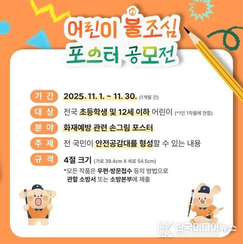 [ 한국미디어뉴스 이종철 기자 ] 해남소방서가 11월 불조심 강조의달을 맞아 이달 21일까지 지역 내 초등학생 및 12세 이하 어린이를 대상으로 불조심 포스터 공모전을 개최한다.