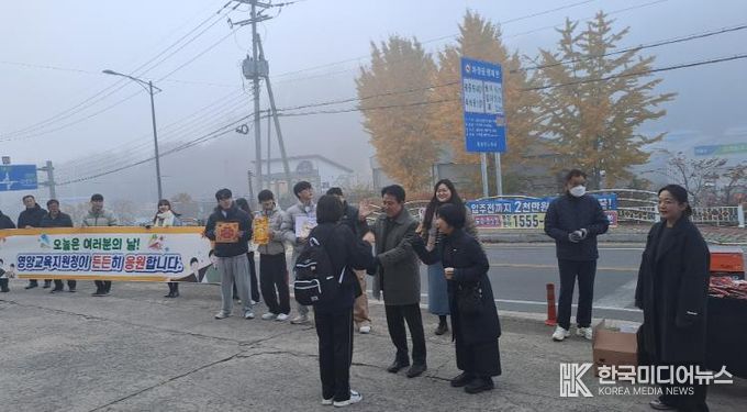[ 한국미디어뉴스 이원영 기자 ] 경상북도영양교육지원청은 2025년 11월 13일 오전 7시 10분부터 영양여자중·고등학교 정문에서 2026학년도 대학수학능력시험에 응시하는 수험생을 대상으로 수험생 응원 행사를 진행했다.