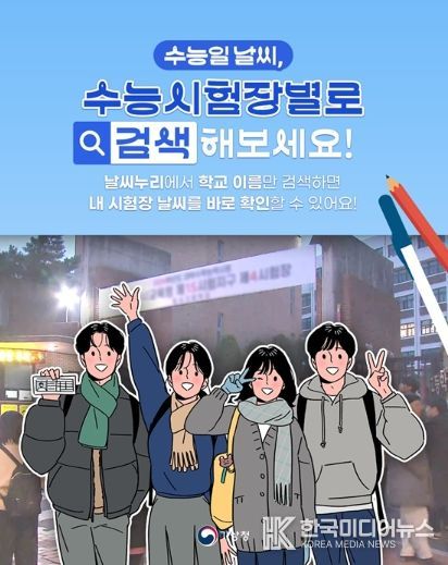 [ 한국미디어뉴스 이원영 기자 ] 날씨누리에서 학교 이름만 검색하면 내 시험장 날씨를 바로 확인할 수 있어요!