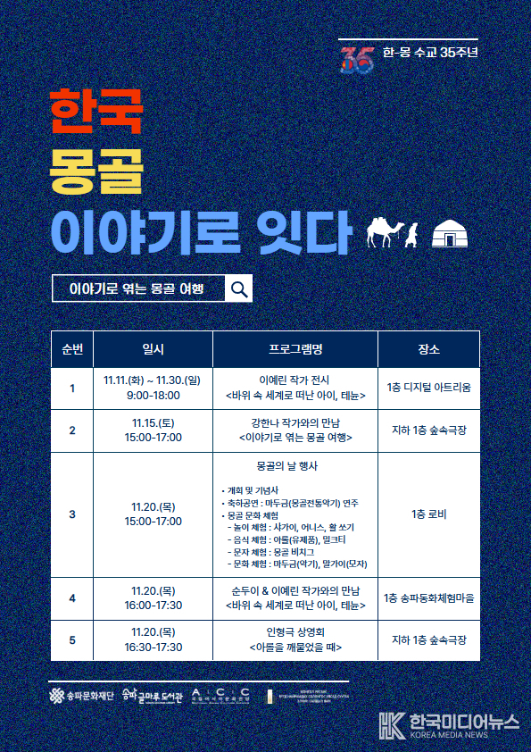 [ 한국미디어뉴스 이원영 기자 ] 오는 20일(목) 오후 (재)송파문화재단(대표이사 이동근) 소속 송파글마루도서관에서 <몽골의 날: 한국-몽골 이야기로 잇다>를 개최한다.