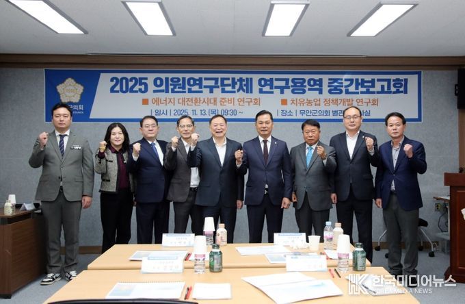 [ 한국미디어뉴스 이종철 기자 ] 무안군의회는 11월 13일 군의회 세미나실에서 ‘에너지 기본소득’과 ‘치유농업 활성화’ 연구 등 2개 의원연구단체의 연구용역 중간보고회를 개최했다.