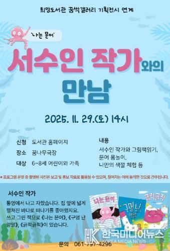 [ 한국미디어뉴스 이종철 기자 ] 광양희망도서관은 오는 11월 29일 3층 꿈싹갤러리에서 현재 성황리에 운영 중인 기획전시 『그림책이 반짝, 친구가 되는 순간』과 연계해 『나는 문어』의 저자 서수인 작가와의 만남 행사를 진행한다고 밝혔다.