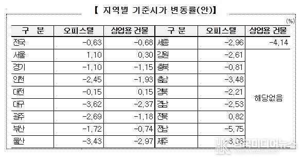 기준시가(안)에 따르면, 오피스텔은 전년 대비 0.6 % 하락, 상업용 건물은 전년 대비 0.7 % 하락한 것으로 확인된다. 다만, 서울 지역의 오피스텔과 상업용 건물 기준시가는 공히 각각 1.1 %, 0.3 % 상승한 것으로 나타난다.