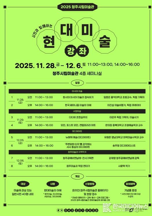 [ 한국미디어뉴스 김풍옥 기자 ] 청주시립미술관은 오는 28일부터 12월 6일까지 현대미술을 폭넓게 이해할 수 있는 ‘시민과 함께하는 현대미술강좌’를 개최한다.