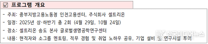 [ 한국미디어뉴스 이원영 기자 ] 중부지방고용노동청(청장 김윤태)은 올해 바이오 분야 대한민국 일자리 으뜸기업인 주식회사 셀트리온과 협업을 통해 「셀트리온 멘토링 Day」 프로그램을 성공적으로 운영했다고 18일 밝혔다.