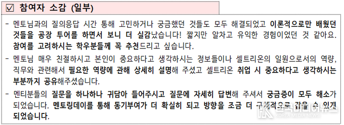 내년에는 더 많은 청년들이 참여할 수 있도록 대학생뿐만 아니라 직업계고로 확대하고 참여기업도 인천지역의 바이오·제약 분야 대기업뿐만 아니라 AI, 전기전자, 뷰티산업 등 우수 중소기업으로 확대하여 청년들에게 보다 다양한 직무 체험과 멘토링 기회를 제공할 예정이다.