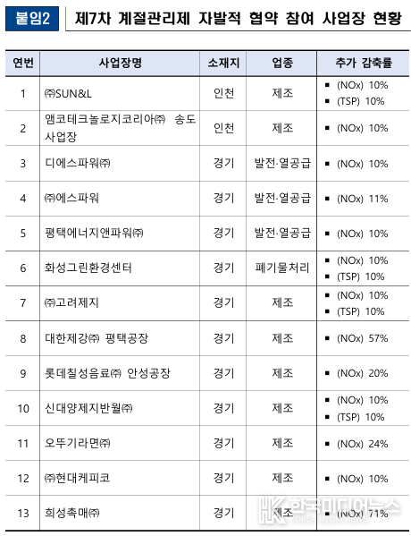 수도권대기환경청은 이번 13개소 사업장과 새롭게 협약을 추진함으로써 2019년부터 현재까지 총 93개소(기존 80개소)와 협약을 체결하게 된다. 협약 참여사업장을 확대함으로써 제7차 계절관리제 기간 산업부문의 대기오염물질 배출량이 추가 감축될 것으로 기대된다.