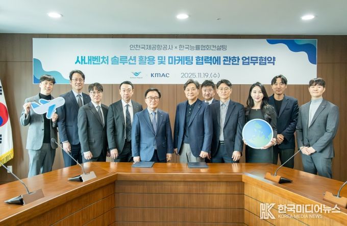 [ 한국미디어뉴스 이원영 기자 ] 인천국제공항공사(사장 이학재)는 19일 오전 공항청사 회의실에서 한국능률협회컨설팅(KMAC)과 ‘인천공항 사내벤처 솔루션* 활용 및 마케팅 협력을 위한 업무협약(MOU)’을 체결했다고 밝혔다.