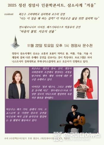 [ 한국미디어뉴스 이원영 기자 ] 정선 정암사는 오는 11월 22일 오후 1시, 천년 고찰 정암사 문수전에서 ‘2025 정암사 인문학콘서트 삼소사계 – 겨울’을 열고, 한 해의 여정을 마무리한다.