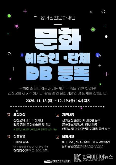 [ 한국미디어뉴스 김풍옥 기자 ] 충북 진천군 생거진천 문화재단은 진천군 문화예술인·단체 데이터베이스(DB) 구축을 위해 오는 12월 19일까지 등록 신청을 받는다고 21일 밝혔다.