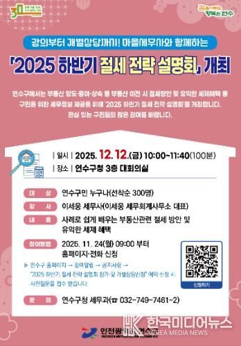 [ 한국미디어뉴스 이원영 기자 ] 연수구는 다음 달 12일 오전 10시부터 구청 대회의실에서 유용한 세무 정보를 제공하는 ‘2025 하반기 절세 전략 설명회’를 연다.