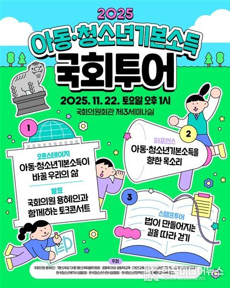 [ 한국미디어뉴스 이원영 기자 ] 기본소득당 용혜인 의원은 오는 11월 22일 오후 1시, 국회의원회관 제3세미나실에서 '2025 아동·청소년기본소득 국회투어'를 개최한다. 이날 국회투어에는 100명이 넘는 아동·청소년·양육자·교육자가 모여 아동·청소년기본소득을 요구하고 나선다.
