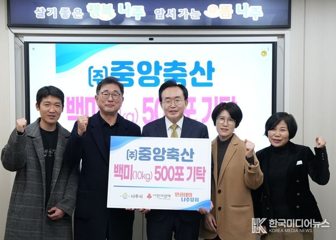 [ 한국미디어뉴스 이종철 기자 ] 전라남도 나주시가 지역기업 ㈜중앙축산으로부터 사회복지시설과 취약계층을 위한 백미 500포 기탁을 받아 겨울철 생활안정을 위한 나눔 확산에 나섰다.