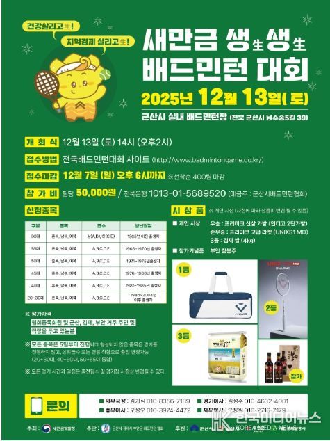 [ 한국미디어뉴스 이원영 기자 ] 새만금개발청은 오는 12월 13일 군산 실내배드민턴장에서 새만금 지역 주민의 건강을 살리고(生), 경제도 살린다(生)는 의미로 ‘새만금 생生생生배드민턴대회’를 개최한다.
