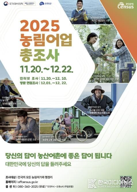 [ 한국미디어뉴스 김풍옥 기자 ] 충북 진천군은 ‘2025 농림어업총조사(인터넷 조사 11. 20.~)’를 오는 12월 1일부터 방문 면접 조사를 실시한다고 24일 밝혔다.