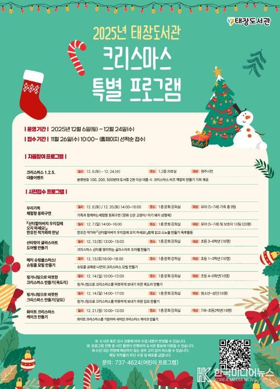 특별 프로그램으로 태장도서관 도서를 대출하면 크리스마스 책갈피 만들기 기회를 제공하는 ‘크리스마스 1.2.5. 대출 이벤트’, 유아와 가족이 함께 동화 속 여행을 떠날 수 있는 ‘우리가족 체험형 동화구연’, 그림책 작가와 함께 책을 읽고 독후활동으로 책에 대한 흥미를 돋우는 ‘산타할아버지 우리집에 오지 마세요!, 한유진 작가와의 만남’ 등이 진행된다.