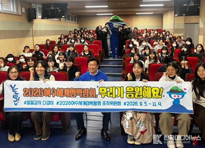 [ 한국미디어뉴스 이종철 기자 ] (재)2026여수세계섬박람회 조직위원장 정기명 여수시장이 섬박람회를 알리기 위해 여수 중앙여자고등학교에 일일교사 다섬이로 나섰다.