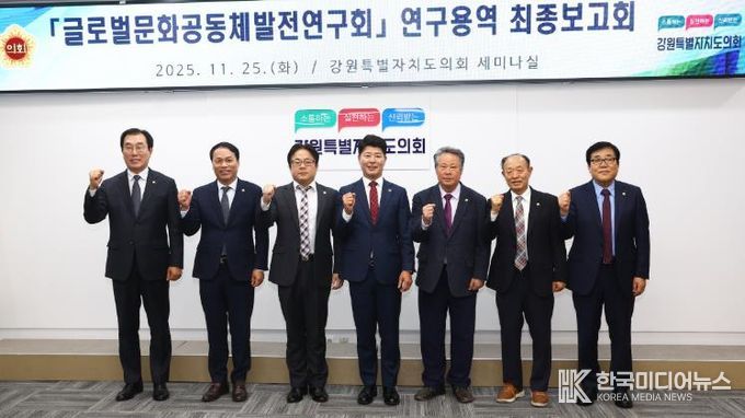[ 한국미디어뉴스 이원영 기자 ] 강원특별자치도의회 '글로벌문화공동체발전연구회' 는 11월 25일 도의회 세미나실에서 '강원특별자치도 이민정책 추진 방향' 연구용역 최종보고회를 개최했다.