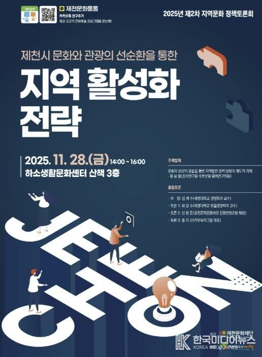 [ 한국미디어뉴스 김풍옥 기자 ] 제천문화재단은 오는 2025년 11월 28일 오후 2시, 하소생활문화센터 3층 산책홀에서 '2025년 제2차 지역문화 정책토론회'를 개최한다고 밝혔다. 이번 토론회는 문화와 관광의 유기적 연계를 통해 지역경제를 활성화하고, 지속 가능한 지역문화 기반을 확장하기 위한 전략을 논의하기 위해 마련됐다.