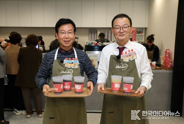 [ 한국미디어뉴스 이종철 기자 ] 박병규 광산구청장과 정선교 대명외식산업 대표가 27일 광산구청 1층 모두의 쉼터 조성을 기념해 청각장애인의 자립을 돕는 일터인 구청 내 ‘카페홀더’에서 일일 명예점장 사회공헌활동을 진행했다.